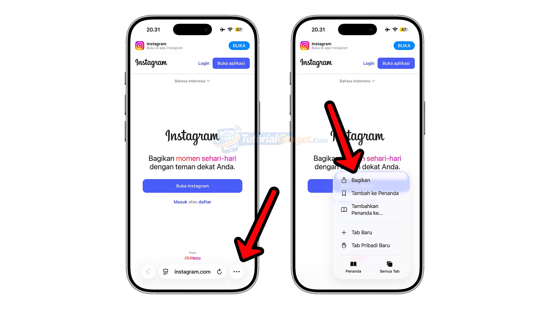 1. Silakan buka halaman utama situs Instagram melalui browser Safari, kemudian tap menu menu 3 titik seperti yang ditunjukkan berikut, lalu pilih menu Bagikan