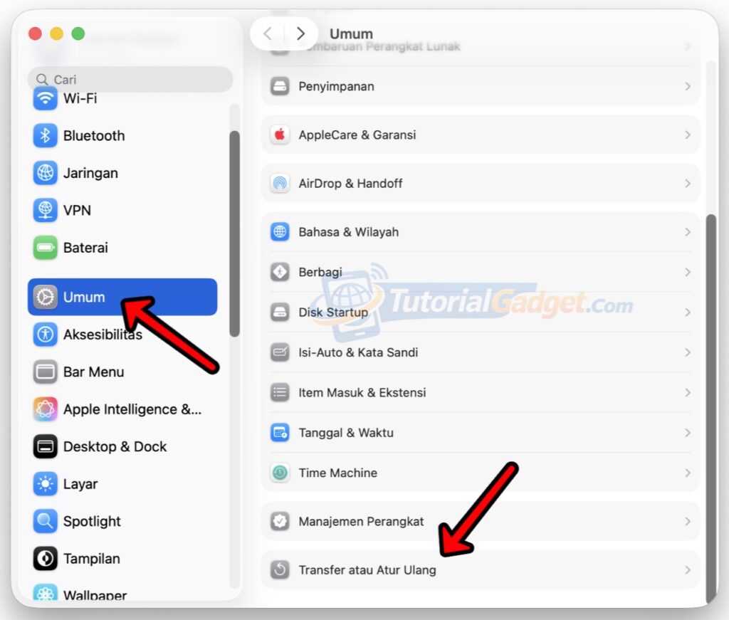 Selanjutnya, pada aplikasi pengaturan sistem, silakan masuk ke menu Umum, lalu cari dan pilih menu Transfer atau Atur Ulang yang umumnya ada di bagian paling bawah seperti yang ditunjukkan oleh gambar berikut.